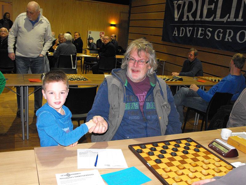 Jelte de kleinzoon van sponsor Wim Vrieling doet de openingszet aan het bord van Tjalling van de Bosch